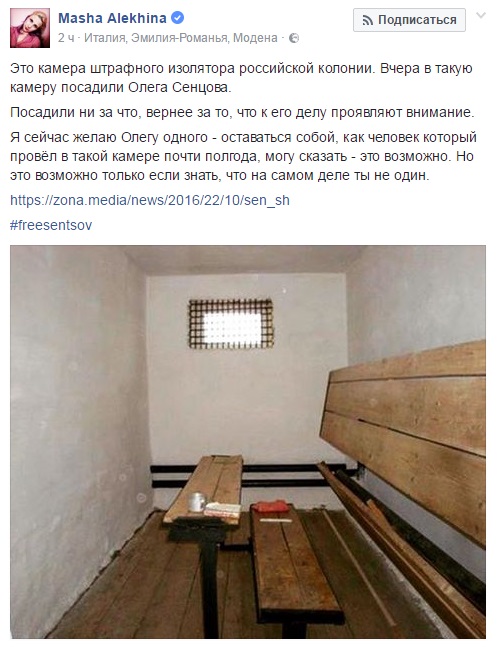 На своей странице в социальной сети Facebook Алехина опубликовала фото ШИЗО, куда поместили Олега Сенцова, и отметила, что данное наказание украинцу последовало за то, что его делом активно интересуются.