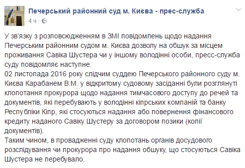 Средства массовой информации распространили сообщение о том, что Печерский районный суд города Киева разрешил проведение обыска у журналиста Савика Шустера. Однако пресс-служба самой судебной инстанции опровергла эти данные.