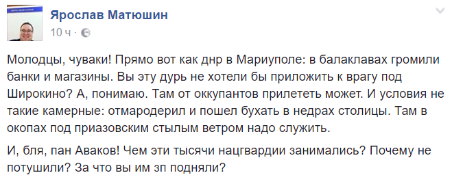 Пользователи сообщают, то что происходило вчера при протестах, очень напоминает события в "ДНР", когда люди в балаклавах яростно громили офисы. Об этом написал известный блогер Ярослав Матюшкин на собственной странице в социальной сети Facebook.