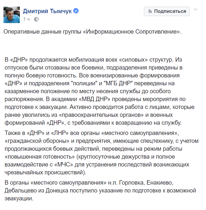 По сообщениям Тымчука, уволенные из правоохранительных органов боевики получают требования о возвращении на службу. В Луганске и Донецке местные "власти" перевели на усиленный режим работы ряд предприятий и органов исполнительной власти для координации действий с "Министерством по чрезвычайным ситуациям" на случай быстрого устранения возможных ЧС.