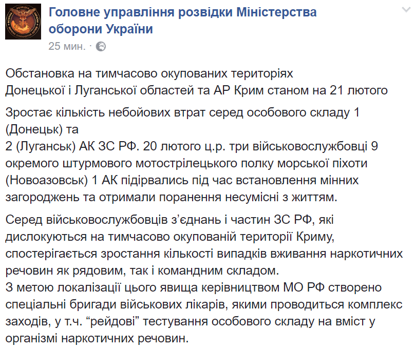 Также в разведке отметили, что получена информация о росте употребления наркотических веществ рядовым и личным составом российской армии, части которой дислоцированы в оккупированном Крыму. Российское командование пытается предпринять меры, чтобы уменьшить распространение наркомании в российских боевых частях полуострова.