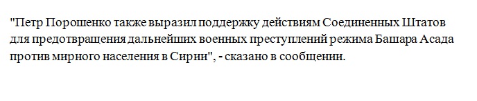 В ходе телефонного разговора с вице-президентом Штатов Майком Пенсом Порошенко отметил, что он лично поддерживает действия США по Сирии, так как Белый дом преследует исключительно цель предотвращения преступлений режима Асада против мирного населения своего же государства.