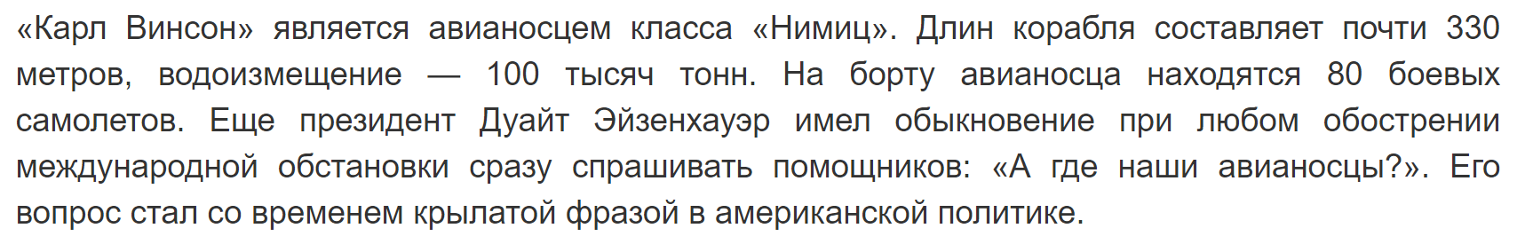 В составе указанной боевой группы находится атомный авианосец «Карл Винсон», крейсер и два эсминца, вооруженных управляемыми ракетами.