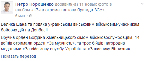"Большое уважение и благодарность украинским военным - участникам боевых действий на Донбассе!" - написал гарант на своем Facebook.