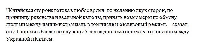Вэй утверждает, что в том случае, если обе стороны изъявят желание, Китай готов поддержать любые меры о перемещении граждан двух стран между территориями государств. Пекин готов даже поддержать либерализацию визового режима с Киевом.