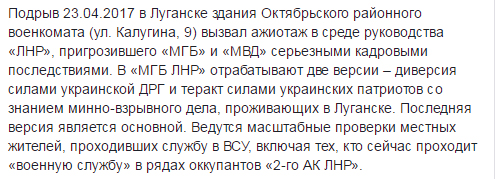 Сотрудники "МГБ" в тот же день выдвинули две версии случившегося: диверсия украинской ДРГ и теракт со стороны местных патриотов, которые хорошо разбираются в минно-взрывном деле. Именно на последнюю версию и делают ставку в "МГБ". Началось масштабное расследование, под подозрения попали все те, кто ранее проходил службу в рядах ВСУ и даже те, кто воевал в рядах боевиков в составе "2-го АК ЛНР".