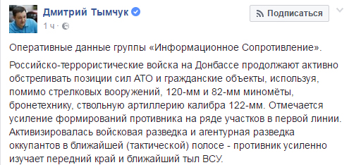 Дмитрий Тымчук, народный депутат и координатор группы "Информационное сопротивление", на своей странице в социальной сети опубликовал последние данные из зоны АТО и оккупированных территорий Донбасса.