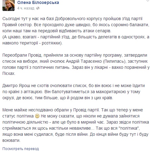 "Он будет баллотироваться по мажоритарке в том округе, где воюет, тем более, он родом из тех краев", - заявила Елена Белозерская, активистка "Правого сектора".
