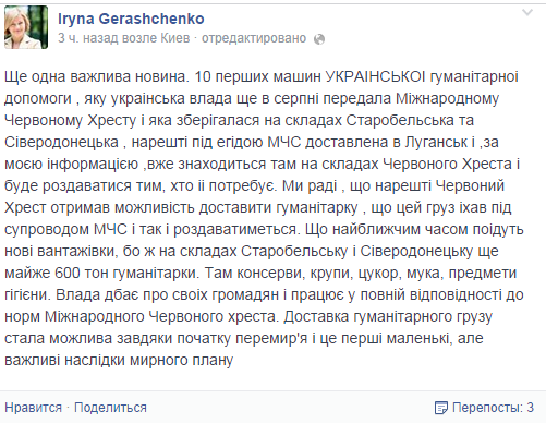 "По моей информации, гуманитарная помощь уже находится там (в Луганске - ред.) на складах Красного Креста и будет раздаваться тем, кто в ней нуждается. Мы рады, что наконец Красный Крест получил возможность доставить гуманитарку, что этот груз ехал при сопровождении МЧС и так и будет раздаваться", — написала Геращенко.