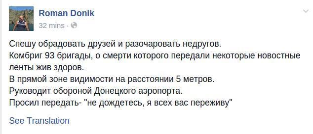 "Спешу обрадовать друзей и разочаровать недругов. Комбриг 93 бригады, о смерти которого передали некоторые новостные ленты, жив-здоров, - пишет Доник. - В прямой зоне видимости на расстоянии 5 метров. Руководит обороной Донецкого аэропорта. Просил передать- "не дождетесь, я всех вас переживу".