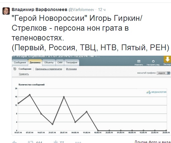 ""Герой Новороссии" Игорь Гиркин/Стрелков - персона нон грата в теленовостях. (Первый, Россия, ТВЦ, НТВ, Пятый, РЕН)", написал Варфоломеев Twitter 2 октября.