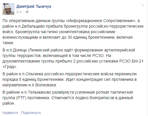 "В район н.п. Ольгинка российско-террористические войска перекинули порядка 8 единиц бронетехники. Идет концентрация сил противника в направлении н.п. Волноваха. В районе н.п.Тельманово развёрнута усиленная ротная тактическая группа (РТГ) противника. Отмечается подвоз боеприпасов в данный район", - добавил Тымчук.