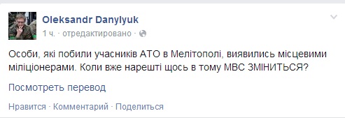 "Лица, которые избили участников АТО в Мелитополе, оказались местными милиционерами. Когда уже наконец-то в том МВД ИЗМЕНИТСЯ?",- написал Данилюк у себя в Facebook.