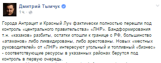 "Бандформирования так называемых «казаков» разбиты, остатки отошли к границе с РФ, большинство "атаманов" или ликвидированы, или арестованы. Новых местных руководителей от "ЛНР" интересуют угольный и топливный "бизнес" - соответствующие ресурсы в указанных районах берутся под контроль в первую очередь", - говорится в сообщении.