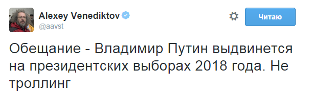 "Обещание - Владимир Путин выдвинется на президентских выборах 2018 года. Не троллинг", - написал Венедиктов.