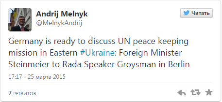 "Состоялась встреча спикера ВРУ (Верховной рады) В.Гройсмана с главой МИД ФРГ Ф.-В.Штайнмайером: Германия готова обсуждать вопросы миротворческой миссии в Украине", - написал Мельник у себя в Твиттере.