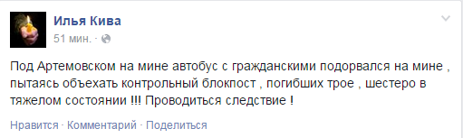 "Под Артемовском на мине автобус с гражданскими подорвался на мине, пытаясь объехать контрольный блокпост, погибших трое, шестеро в тяжелом состоянии", - написал Кива у себя в Facebook.