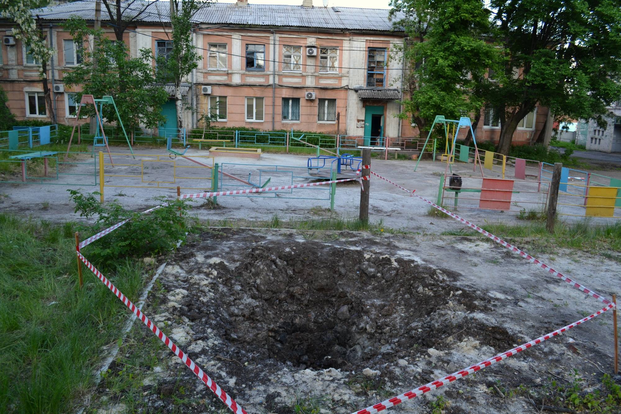 Вечером 25 мая рядом с детской площадкой на пересечении проспектов Киевского и Засядько в Донецке упал снаряд.