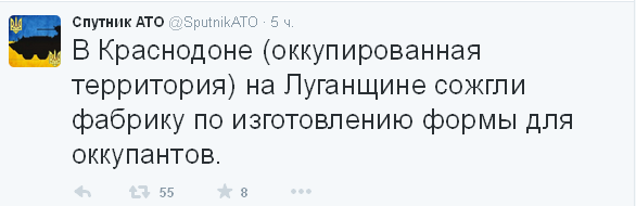 "В Краснодоне (оккупированная территория) на Луганщине сожгли фабрику по изготовлению формы для оккупантов". Местные полагают, что это дело рук украинских партизан".