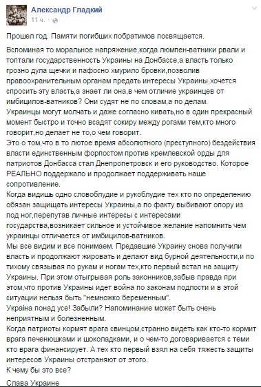 Слава Украине!", - написал у себя в facebook Александр Гладкий, глава партизанского отряда "Тени".
