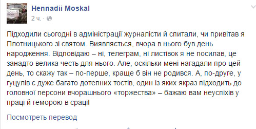 «Подходили сегодня в администрации журналисты и спросили, поздравил я Плотницкого с праздником. Оказывается, вчера у него был день рождения. Отвечаю - нет, телеграмм, ни открыток я не посылал, это слишком большая честь для него. Но, поскольку мне напомнили об этом дне, то скажу так - во-первых, лучше бы не родиться. А, во-вторых, у гуцулов очень много остроумных тостов, один из которых как раз подходит к главной персоне вчерашнего «торжества» - желаю вам неуспехом в работе и геморроя в жопе!», - написал губернатор.