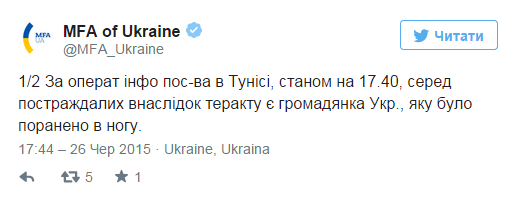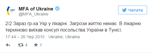 В пятницу, 26 июня, в результате теракта в городе Сус, расположенного на северо-востоке Туниса, ранение получила гражданка Украины. Об этом сообщает Twitter Министерства иностранных дел (МИД) Украины.