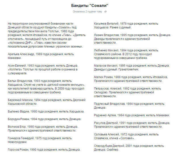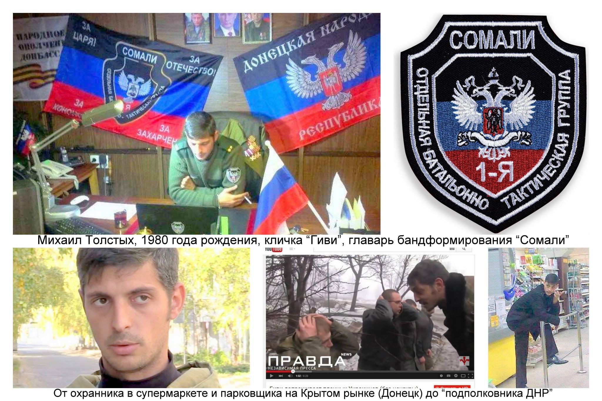«На территории оккупированной боевиками части Донецкой области орудуют бандиты "Сомали" под предводительством Михаила Толстых, 1980 года рождения, жителя Иловайска, по кличке "Гиви". "Деятель ополчения", прошедший путь от парковщика до "полковника ДНР". "Гиви" известен своими показательные допросами пленных украинских военных», - написал он.