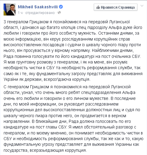 В сообщении также сказано, что Грицак понимает ту ответственность, которая на него ложится. Он также понимает необходимость чистки в рядах Службы безопасности Украины. Саакашвили также подчеркнул, что временно исполняющий обязанности главы СБУ отметил, что первоочередной задачей должна стать борьба с коррупцией. Уже сейчас в поле зрения СБУ находятся несколько коррупционных дел высокопоставленных должностных лиц. И, судя по шквалу черного пиара в отношении Грицака, эти дела продвигаются успешно, - отметил Саакашвили.