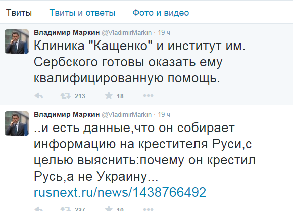 "Он (Матиос - Ред.) собирает информацию на крестителя Руси, с целью выяснить: почему он крестил Русь, а не Украину. Клиника Кащенко и институт имени Сербского готовы оказать ему квалифицированную помощь", - написал Маркин.