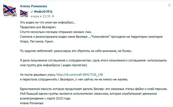 «Это видео ни что иное, как инфовброс. Придумано все Безлером. Спустя несколько месяцев открываю занавес лжи. Снимала и режиссировала видео жена Безлера ..."Киносъемки" проходили на территории санатория Искра, Песчаное, Крым», - написала Романова.