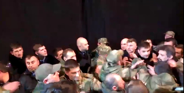 В это время группа неизвестных мужчин в камуфляжной форме подошла к активистам, после чего завязалась драка. После того, как нарушителей разняли общественное слушание, как и зал заседания были закрыты, с целью соблюдения общественной безопасности.