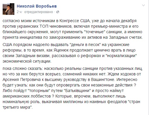 пока сложно сказать: насколько реальны санкции против указанных лиц, но что за них берутся всерьез, сомнений никаких нет. Ждем ходоков от Арсения Петровича к высшему руководству в Вашингтоне. Интересно будет узнать: как они будут опровергать свои незаконные действия ? Либо пойдут "топорным" путем "Батьківщини" и просто наймут американских лоббистов ? Которые, впрочем, выполняют лишь номинальную роль, выкачивая миллионы из наивных феодалов "стран третьего мира".", - пишет Воробьев.
