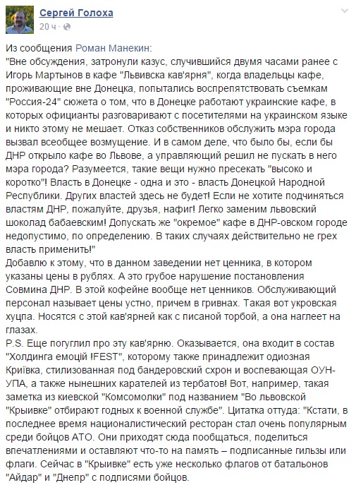 "Вне обсуждения, затронули казус, случившийся двумя часами ранее с Игорь Мартынов в кафе "Львівська кав`ярня", когда владельцы кафе, проживающие вне Донецка, попытались воспрепятствовать съемкам " Россия24" сюжета о том, что в Донецке работают украинские кафе, в которых официанты разговаривают с посетителями на украинском языке и никто этому не мешает. Отказ собственников обслужить мэра города вызвал всеобщее возмущение". – негодует один из "идейных вдохновителей республики".