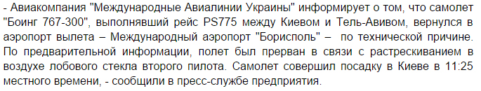 По данным "МАУ", во время полета растрескалось лобовое стекло второго пилота. Угрозы для пассажиров не было. Из-за неисправности пассажирам пришлось ожидать следующего самолета до 13:30.