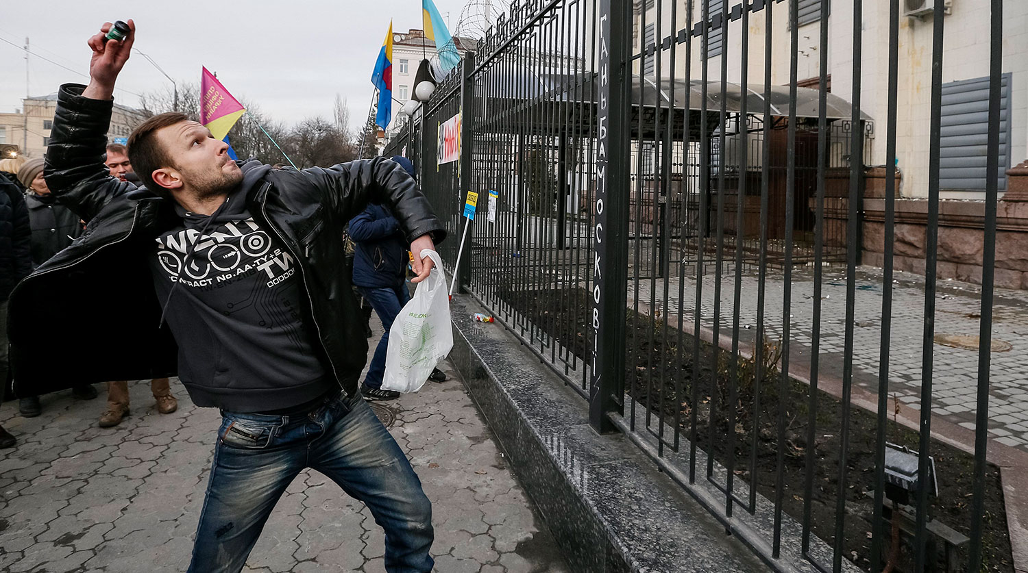 Митинг под посольством РФ в Киеве продолжается: в здание летят камни и яйца