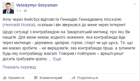 "Хочу через "Фейсбук" ответить Геннадию Москалю, поскольку и он обратился ко мне через Интернет. Относительно ситуации с контрабандой на Закарпатской таможне, о которой Вы пишете. Для меня не имеет никакого значения, какая контрабанда идет через таможню - древесина, сигареты, орехи, спирт или еще что-то. То, что мы должны сделать, - не решать, какая контрабанда хуже, а остановить любую контрабанду вообще", - отметил он.