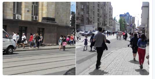 В центр города для участия в праздничном шествии привезли сотни людей из окрестных городов. По словам дончан, в толпе слышны слова удивления тем, что некогда красивейший город Украины превращается в подобие вымирающих донбасских поселков.