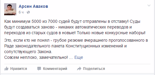 "Как минимум 5000 из 7000 судей будут отправлены в отставку! Суды будут создаваться заново - никаких автоматических переводов и переходов из старых судов в новые! Только новые конкурсные наборы! Это, если кто не понял - грубое резюме вчерашнего проголосованного в Раде законодательного пакета Конституционных изменений и сопутствующего Закона. Совсем неплохо, замечательно", - сообщил чиновник.
