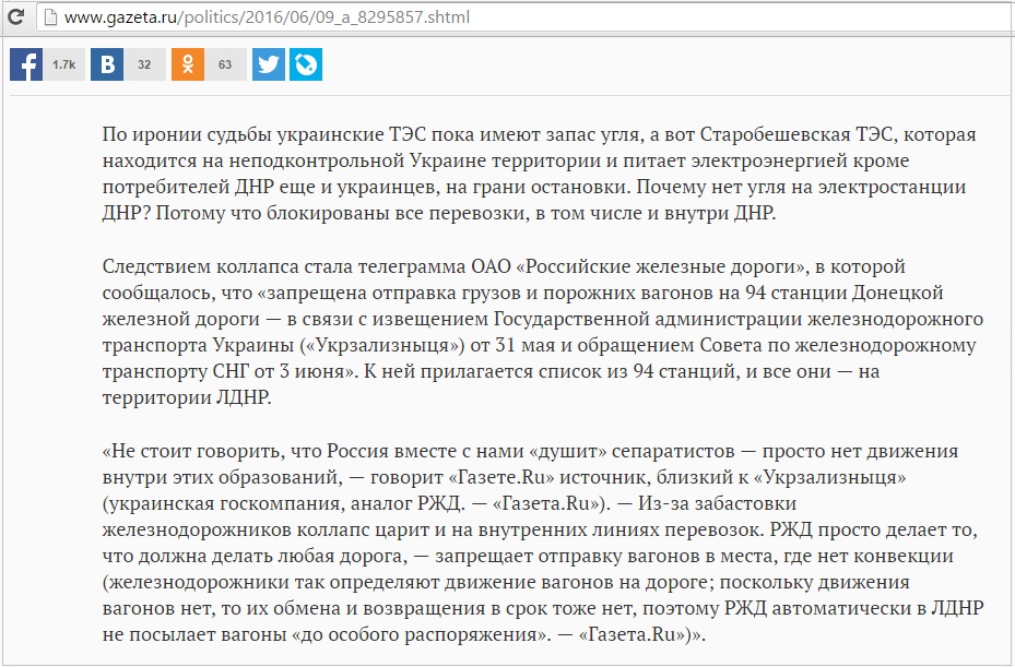 Издание отмечает, что следствием дорожно-транспортного коллапса стала телеграмма ОАО "Российские железные дороги", в которой сообщалось о запрете отправки грузов и пустых вагонов на 94 станции Донецкой железной дороги — в связи с извещением Государственной администрации железнодорожного транспорта Украины ("Укрзализныця") от 31 мая 2016 года и обращением Совета по железнодорожному транспорту СНГ от 3 июня текущего года.