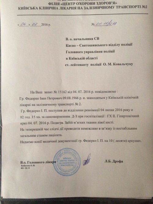 На данный момент Федорко находится в реанимации Железнодорожной клинической больницы №2. Несмотря на то, что нужно срочно взять кровь на анализ у виновника ДТП, чтобы определить уровень содержания алкоголя, медики наотрез отказываются предпринимать любые действия. Об этом они заявили в документе, который был отправлен представителям Киево-Святошинского отделения полиции. Медики утверждают, что у Федорко "гипертонический криз, подагра и забой мягких тканей левой кисти". Также проведению анализов препятствует "нестабильное состояние пациента".