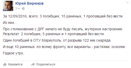 "За 12/09/2016 всего: 3 погибших, 15 раненых, 1 пропал без вести", - написал он.