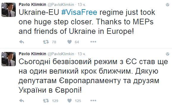 Глава Министерства иностранных дел Украины Павел Климкин сообщил о том, что положительное решение комитета Европарламента по вопросам гражданских прав, юстиции и внутренних дел сделало получение безвизового режима с Евросоюзом еще более реальным