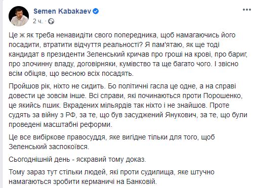 Прошел год, никто не сидит. Потому что политические лозунги это одно, а на деле доказать это совсем другое. Все дела, которые начинаются против Порошенко, это какой-то пшик. Украденных миллиардов так никто и не нашел. Однако судят за войну с РФ, за то, что был осужден Янукович, за то, что были проведены масштабные реформы", - пишет волонтер.