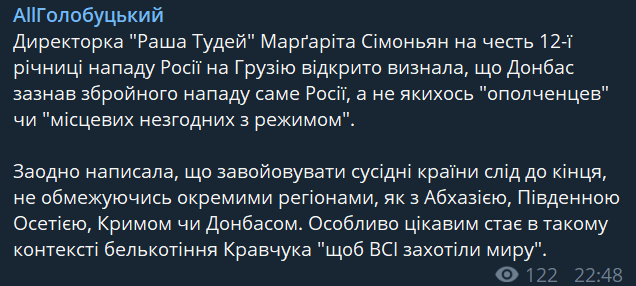 "В честь 12-ой годовщины нападения России на Грузию директор Russia Today открыто признала: на Донбасс напала именно Россия, а не какие-то "ополченцы" или "местные несогласные с режимом". Заодно она написала, что нужно завоевывать соседние страны до конца, не ограничиваясь при этом отдельными регионами, например, Донбассом, Крымом, Южной Осетией или Абхазией. Особенно интересным в этом контексте становится бормотание Кравчука, "чтобы все захотели мира" ", - заявил политолог.