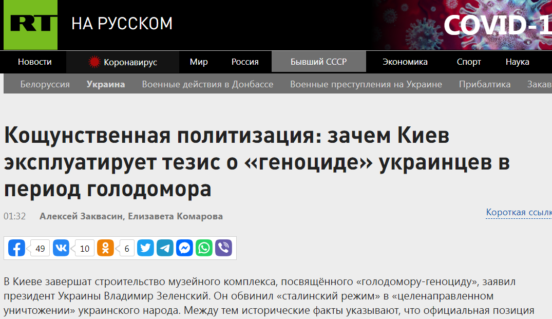 Так, на сайте кремлевского издания Russia Today появился большой материал о том, что Украина якобы политизирует и искажает Голодомор, ставший причиной миллионных жертв украинского народа.