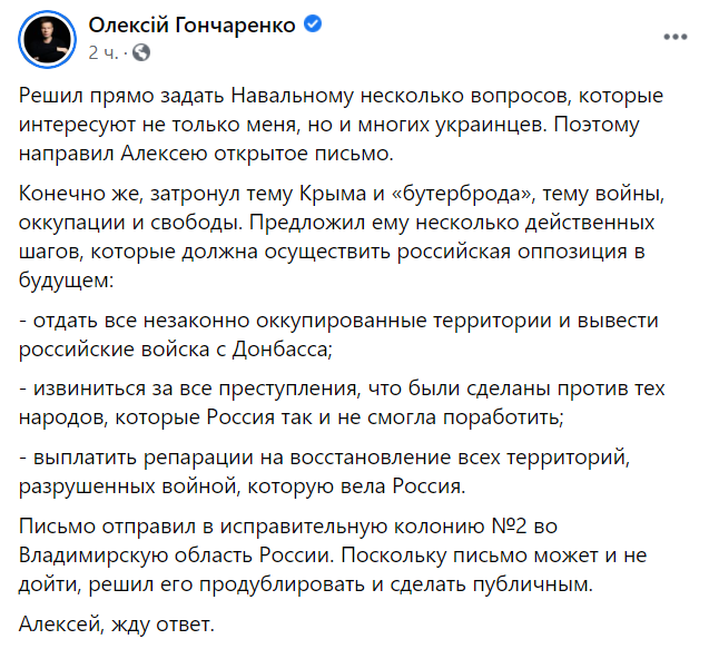 Гончаренко обратился к Навальному из-за скандального заявления про Украину: "Жду ответ"