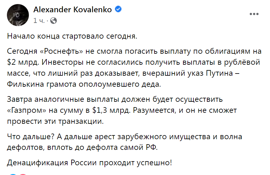 "Начало конца стартовало сегодня. Денацификация России проходит успешно!" - отмечает эксперт.