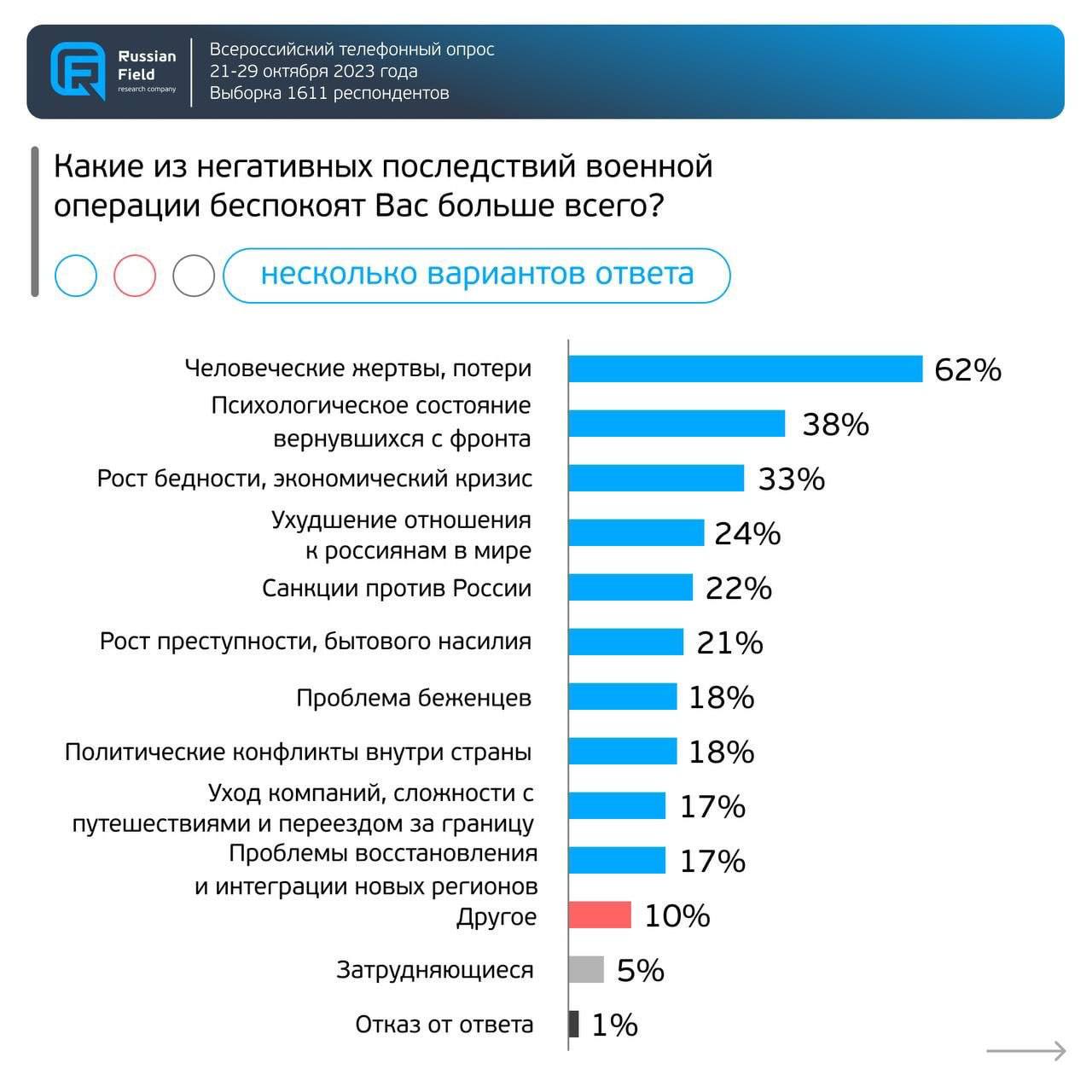 Согласно последнему опросу Russian Field, больше всего граждан РФ в "спецоперации" беспокоят человеческие потери: этот пункт отметили 62% опрошенных. В тройке лидеров "негативных последствий" также возвращение с фронтов в РФ психологически сломленных солдат и рост бедности.
