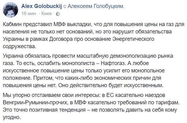 "Кабмин представил МВФ выкладки, что для повышения цены на газ для населения не только нет оснований, но это нарушит обязательства Украины в рамках Договора про основание Энергетического содружества", - рассказал политтехнолог, уточнив, что повышение цены на газ еще и укрепит украинского монополиста "Нафтогаз".