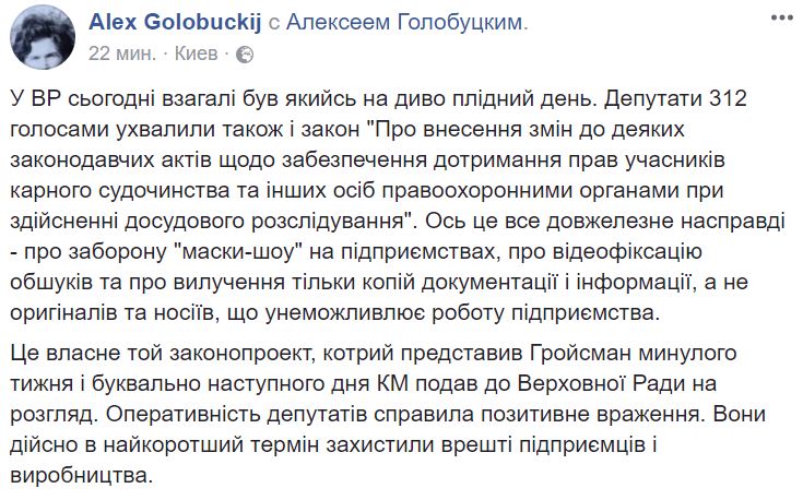 Законопроект предусматривает внесение изменений в акты “по обеспечению соблюдения прав участников уголовного судопроизводства и других лиц правоохранительными органами при осуществлении досудебного расследования”. За этим длинным названием, уверяет Голобуцкий, кроется очень важная вещь. Документ делает невозможным давление силовиков на предпринимателей.